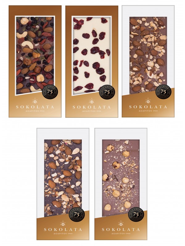 Chocolate bars with nut toppings 100g (5 bars)- Hazelnuts & Milk Chocolate- Nut Mix & Dark / Milk Chocolate- Cranberries & White Chocolate- Almonds & Milk Chocolate- Almonds & Dark Chocolate..